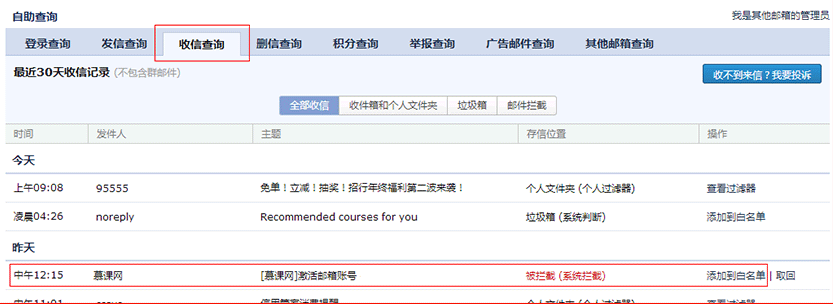 QQ郵箱攔截郵件的查找:(其他郵箱都有類似設(shè)置,把慕課網(wǎng)添加到白名單即可)